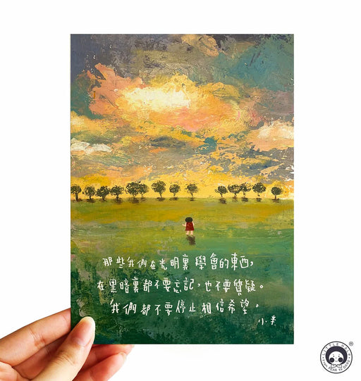 小半 Little HalfIn stock那些我們在光明裏學會的東西,在黑暗裏都不要忘記,也不要質疑。我們都不要停止相信希望。 特色: 畫作爲複印本。 畫作以白色硬咭紙托底,再以獨立透明膠袋包裝,背後有小半燙金LOGO貼紙。 可自由以喜愛的畫框裱起,為空間增添美感和正能量! 送禮自用皆宜。 材質/ 媒介 剛古紙 Conqueror...