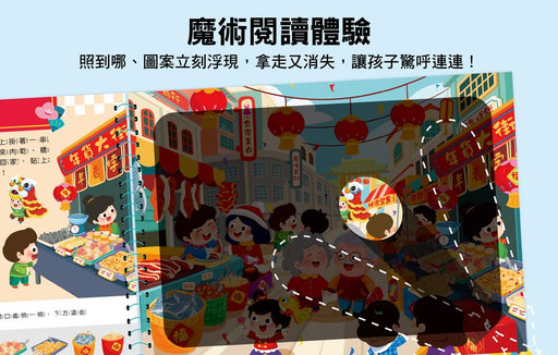 幼福In stock soon一起熱鬧過新年越找越好玩的新年閱讀體驗孩子最愛的新年找一找遊戲書 拿起手電筒,準備一起探索熱鬧的新年街景吧!結合光影找一找的互動玩法,只要用隨書附贈的紙板手電筒照一照,原本看不見的圖案立刻浮現,移開後又會消失,給孩子帶來驚呼連連的閱讀驚喜。書中以熱鬧的新年場景為主題,融入年節習俗、街市風景與生...