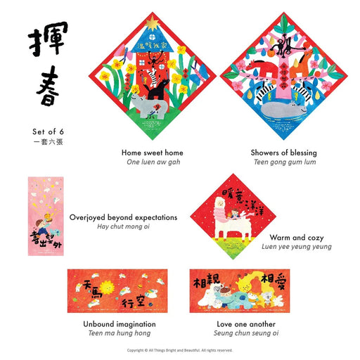 ALL THINGS BRIGHT AND BEAUTIFUL有庫存每一套都有6張揮春,還附上揮春的英文翻譯和發音!紙:260g啞粉卡套裝尺寸: 30×30cm每張揮春印有聖經金句單面印刷 1) 天降甘霖:30×30cm, diecut + 燙金2) 溫暖我家:30×30cm, diecut + 燙金3) 天馬行空:13×30cm 燙金4) 相親相愛:13×3...